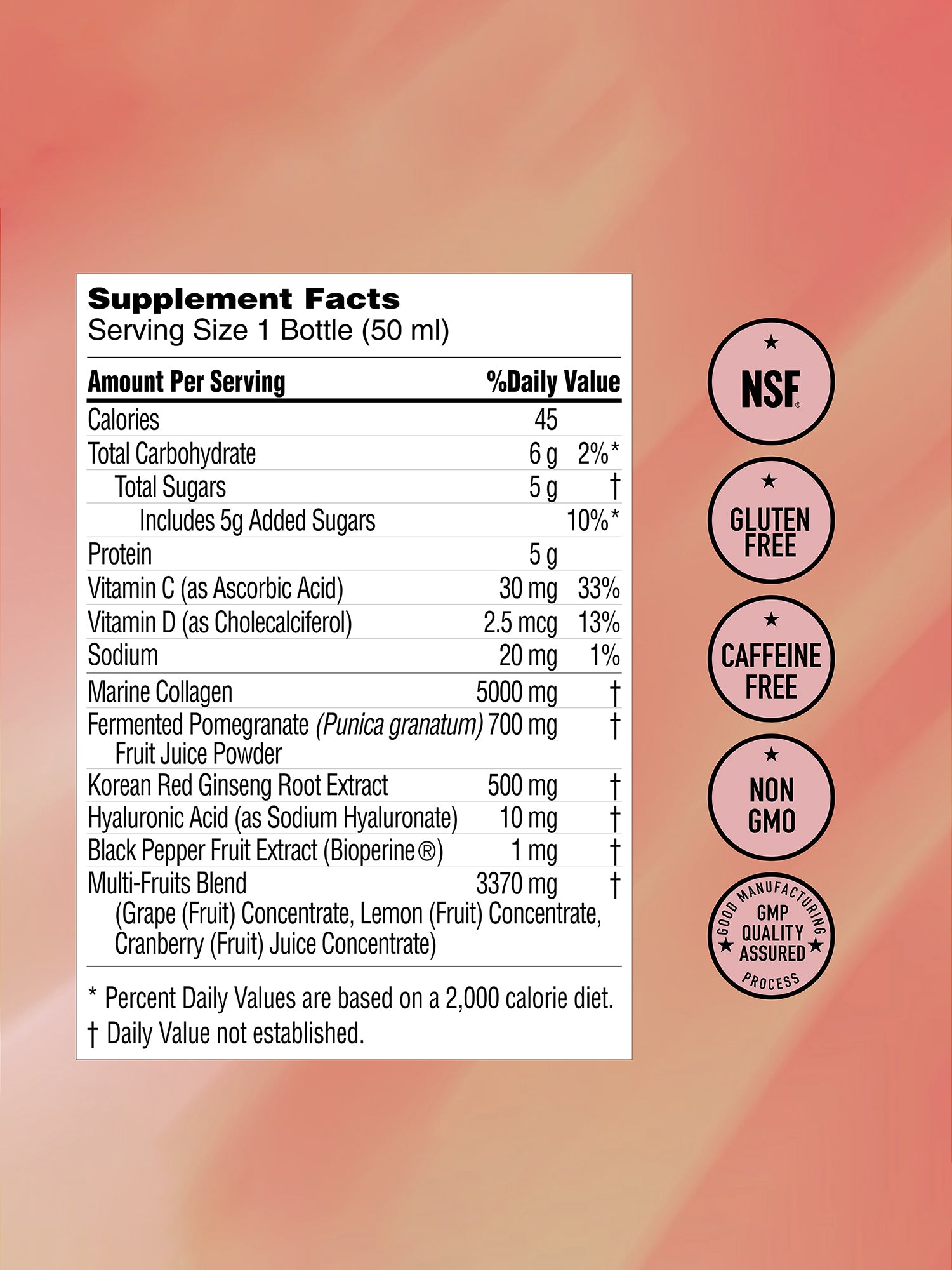 Vitamin C (as Ascorbic Acid), Vitamin D (as Cholecalciferol), Sodium, Marine Collagen, Grape Juice Concentrate, Lemon Juice Concentrate, Cranberry Juice Concentrate, Fermented Pomegranate Juice Powder, G1899 Korean Red Ginseng Extract, Sodium Hyaluronate, BioPerine® Black Pepper Extract, Water, Organic Cane Sugar, Natural Flavor (Strawberry, Blueberry), Steviol Glycosides (from Stevia Leaves) |
