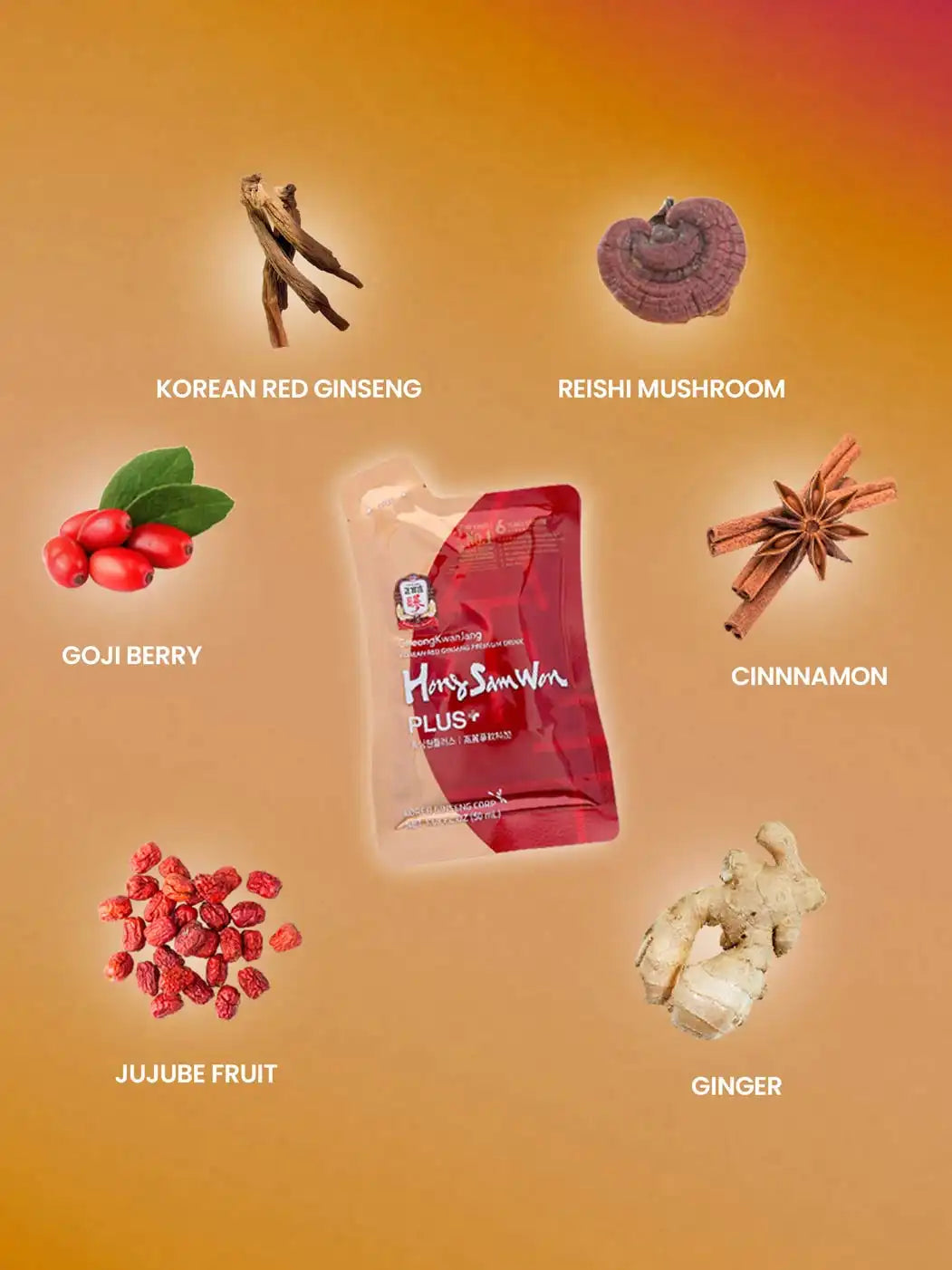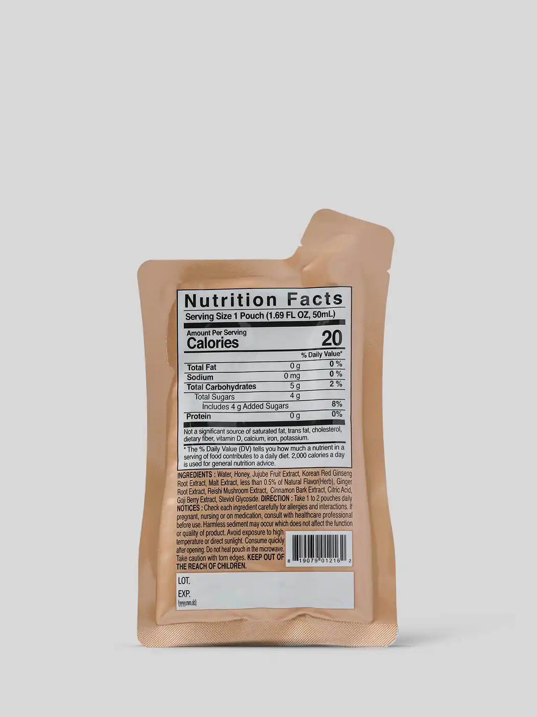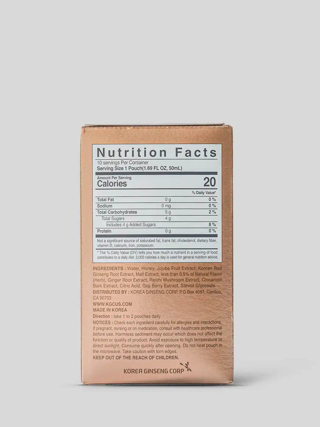 Water, Honey, Jujube Fruit Extract, Korean Red Ginseng Root Extract, Malt Extract, less than 0.5% of Natural Flavor (Herb), Ginger Root Extract, Reishi Mushroom Extract, Cinnamon Bark Extract, Citric Acid, Goji Berry Extract, Steviol Glycoside |