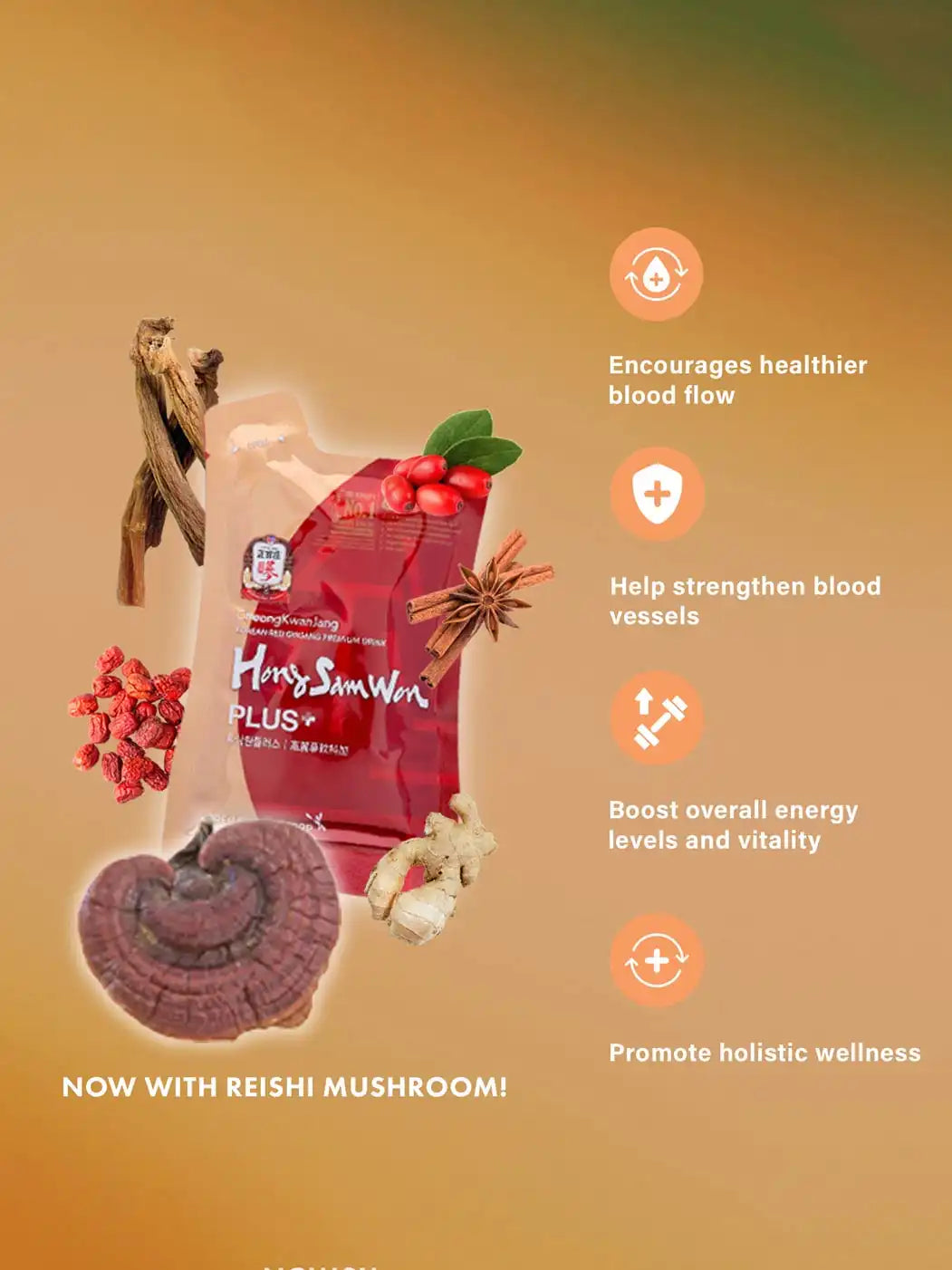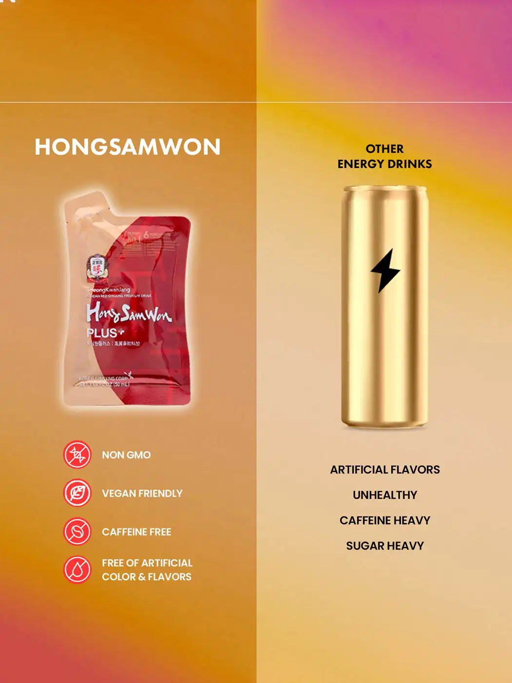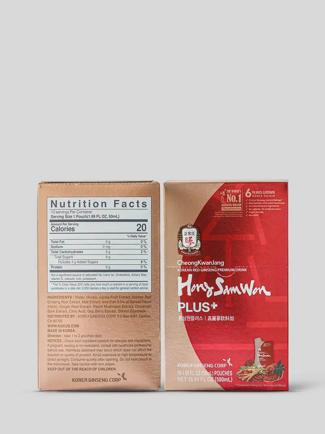 This energizing drink is packed with 360mg of Red Ginseng extract. Double the amount in Hong Sam Won. Made from our premium ginseng, this drink has a smooth flavor from the addition of jujube fruit, cinnamon, and ginger. With zero sugar, this beverage is a perfect treat for those who want to get their blood moving and get a boost of healthy energy for the day.