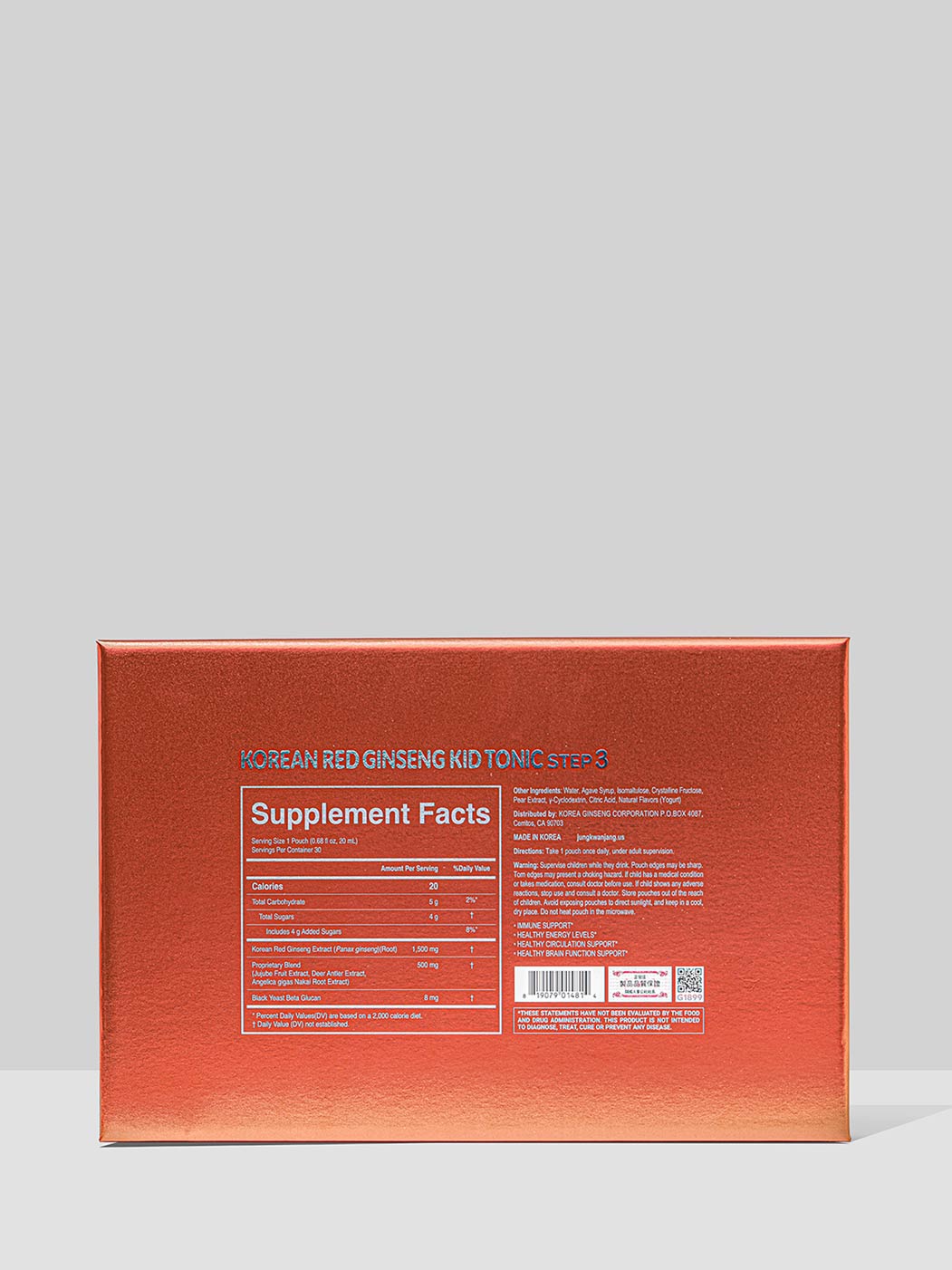 Designed with your children in mind, this is the third step of the CheongKwanJang Kid Tonic series. This step helps build a solid foundation for health and provides your children with all the necessary ingredients to help them build a strong immune system. With Korean Red Ginseng, Deer Antler, and many other valuable ingredients, this is a tonic that is made for your children and should be part of your routine.