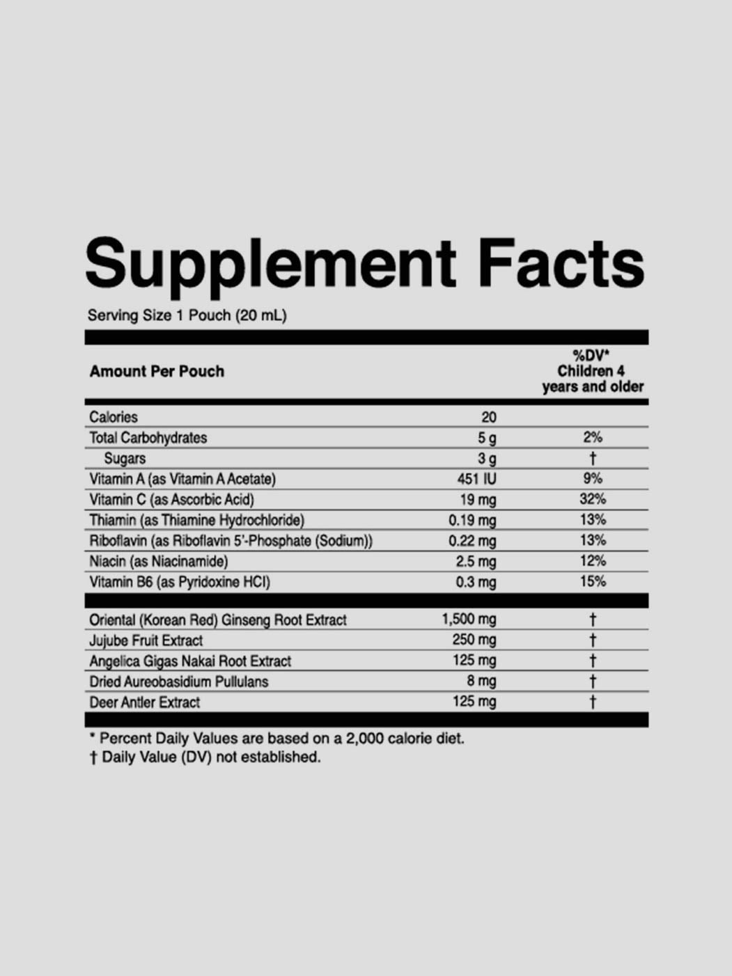 Red Ginseng Root Extract, Vitamin A, Vitamin C, Thiamin, Riboflavin, Niacin, Vitamin B6, Jujube Fruit Extract, Angelica Gigas Root Extract, Dried Aureobasidium Extract, Deer Antler Extract, Purified Water, Isomaltulose, Agave Syrup, Fructo-Oligosaccharide, Galacto-Oligosaccharide, Pear Juice Concentrate, γ-Cyclodextrin, Natural Flavors, Citric Acid |