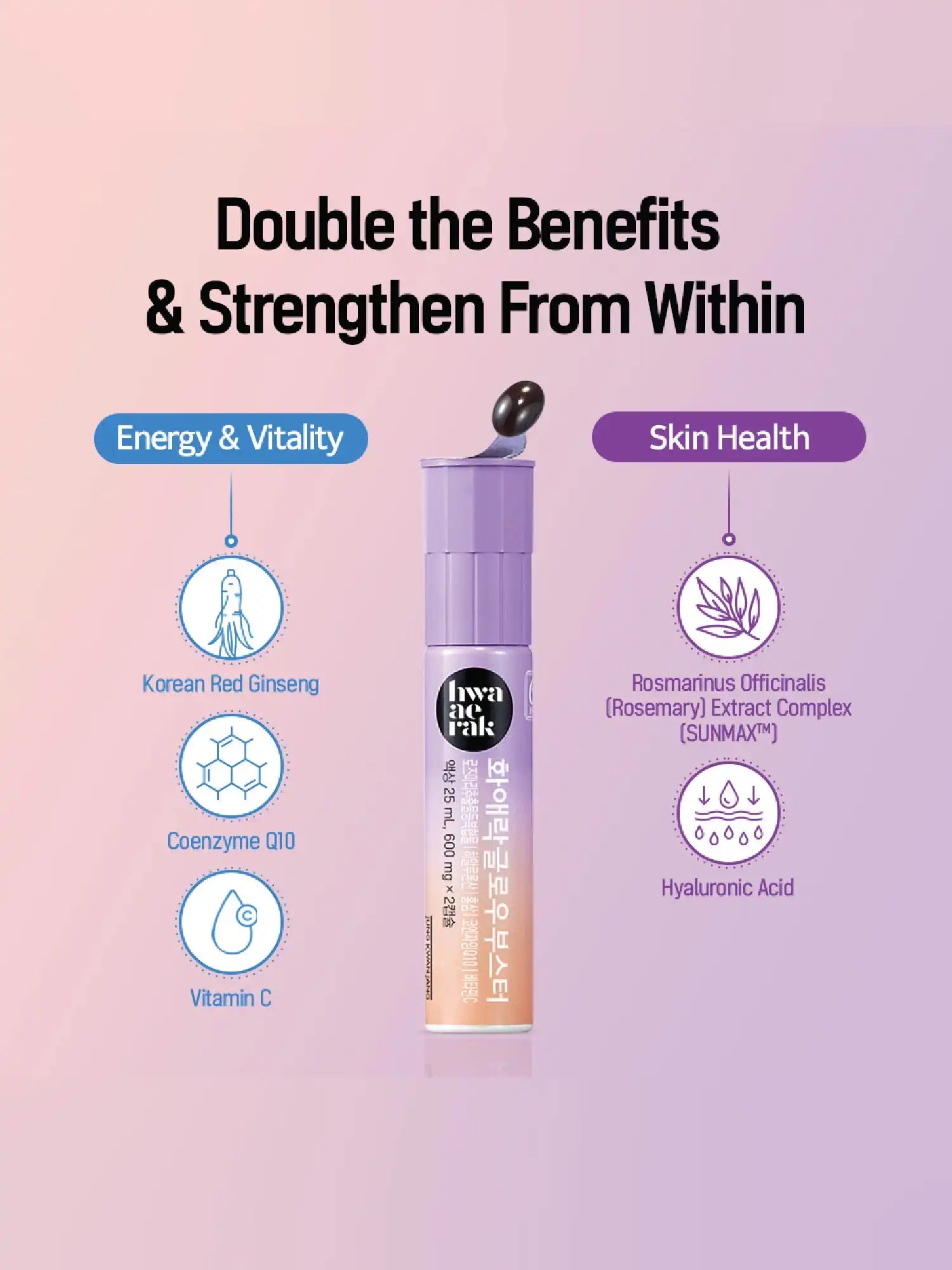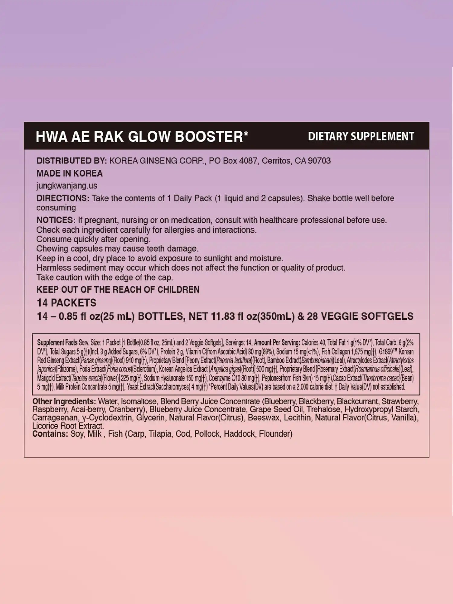 Mejora la salud de tu piel y tu vitalidad interior con el Hwa Ae Rak Glow Booster para la Salud de la Piel de JungKwanJang. Este suplemento de belleza combina los efectos antioxidantes naturales de 910 mg de Extracto de Ginseng Rojo Coreano, 100 mg de Vitamina C, 100 mg de Coenzima Q10, 200 mg de Extracto de Hoja de Romero y Ácido Hialurónico para proporcionar un cuidado completo de la piel y apoyo energético. Diseñado para una fácil ingesta, cada botella incluye una cápsula y un líquido que se deben tomar a diario, proporcionando una dosis energizante y rejuvenecedora para una piel radiante y firme, así como una vitalidad general. Con un refrescante sabor a siete bayas, tomar dos cápsulas al día lo convierte en una deliciosa y conveniente adición a tu rutina de bienestar: ¡cada caja contiene un suministro para 14 días!