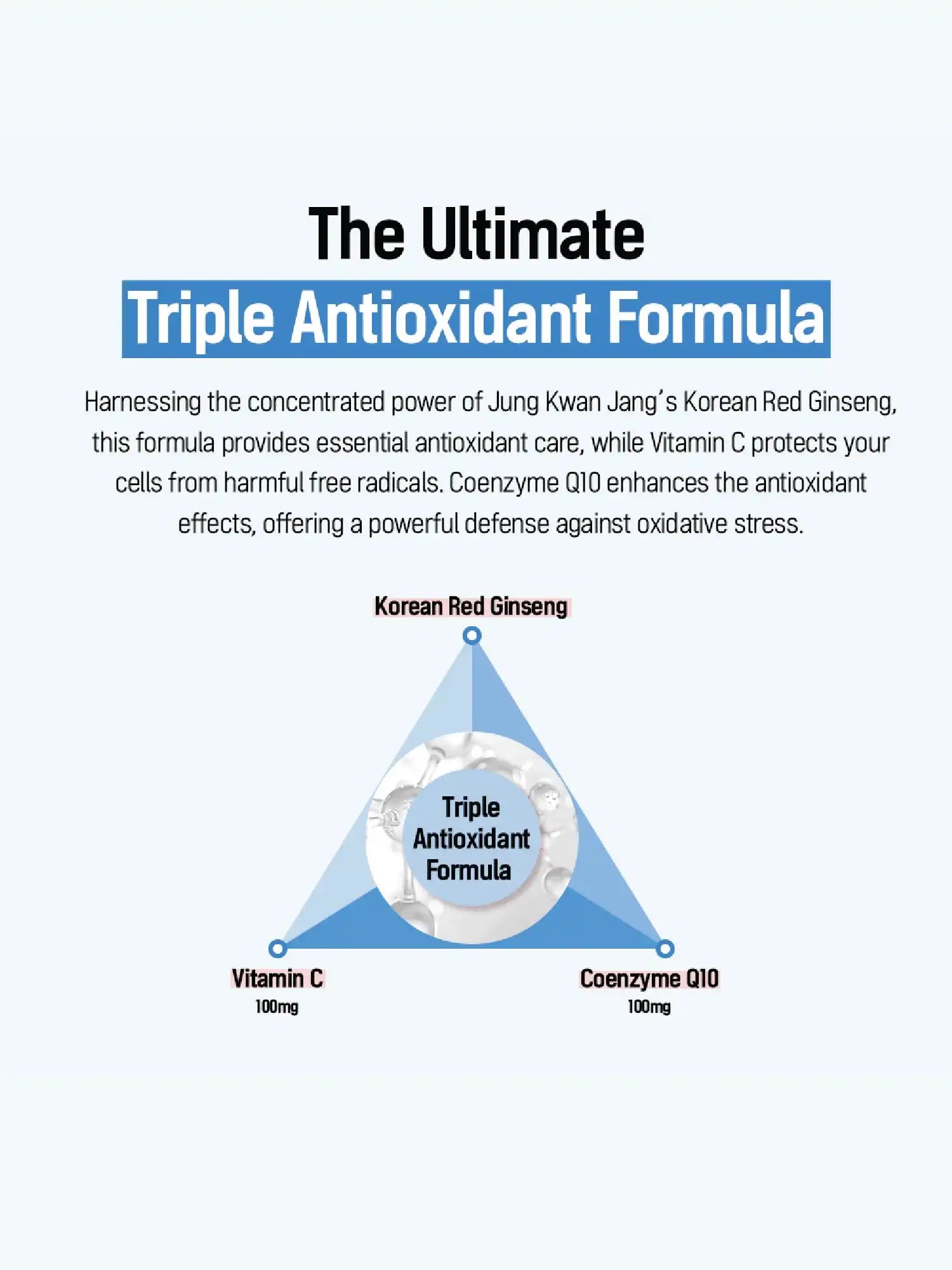 1. Fórmula Triple Antioxidante: El poder combinado del Ginseng Rojo Coreano, la Vitamina C y la Coenzima Q10 ayuda a proteger contra el estrés oxidativo y el daño de los radicales libres mientras aumenta la vitalidad general.