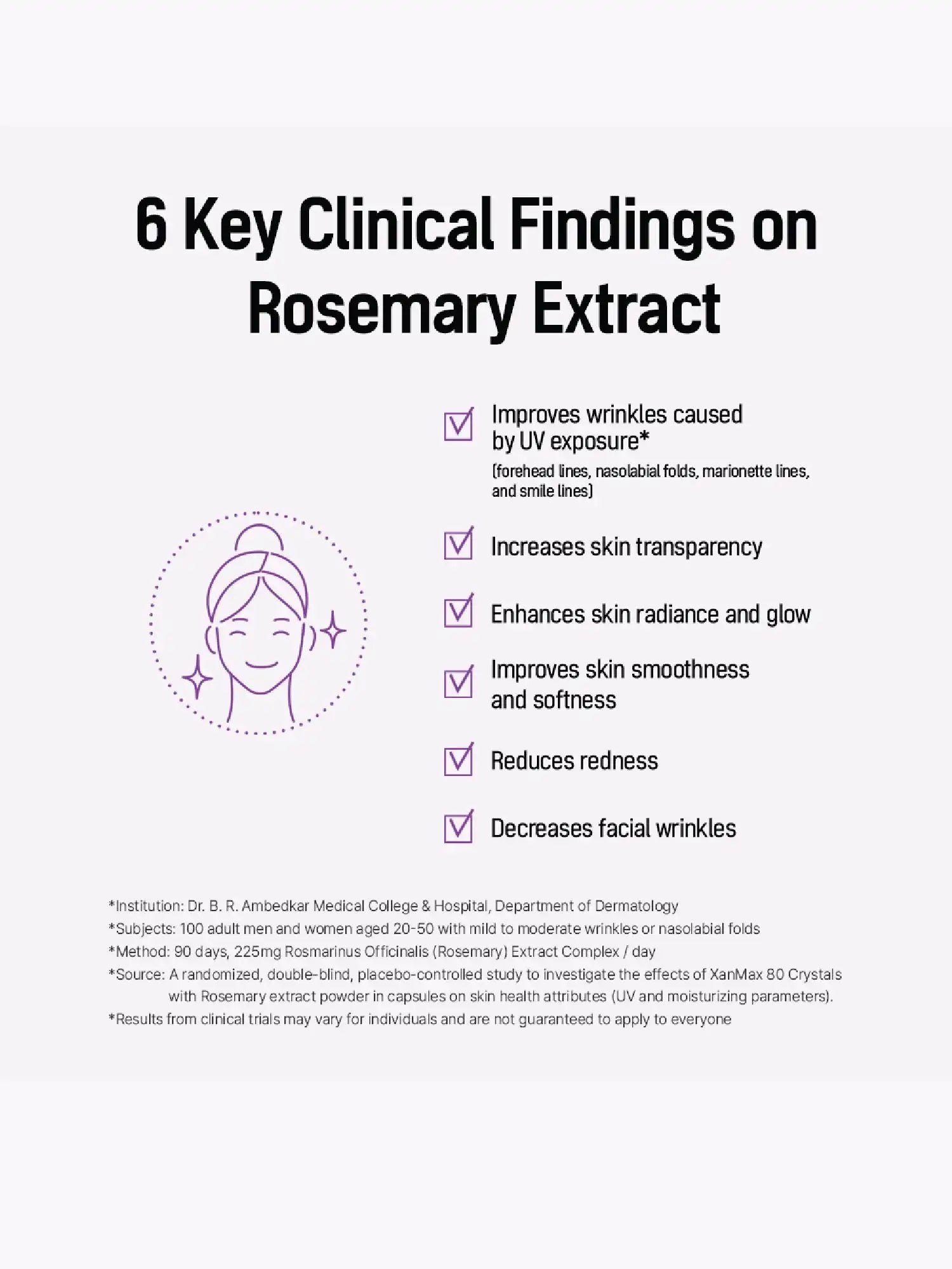 3. Beneficios para la piel clínicamente probados: El extracto de romero reduce las arrugas causadas por la exposición a los UV, mejora la transparencia de la piel y suaviza las líneas finas.