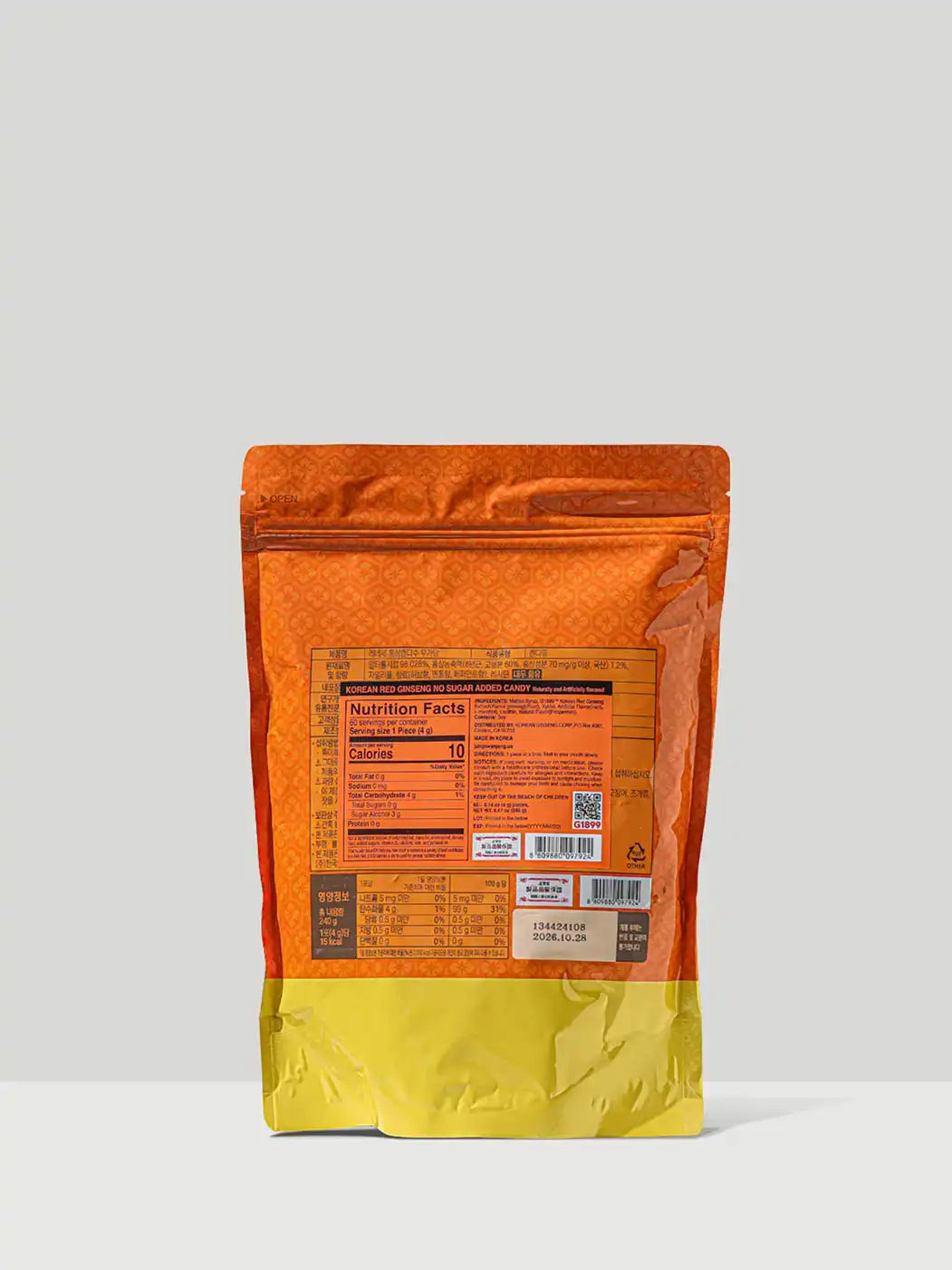 Datos Nutricionales: Cada porción (6g, aprox. 2 piezas) contiene 15 calorías, 5g de carbohidratos, 0g de azúcar, 5g de alcoholes de azúcar (Isomalt, Xilitol), 0g de grasa, 0mg de sodio y 70mg de ginsenósidos por cada 100g de Extracto de Ginseng Rojo Coreano al 12%.