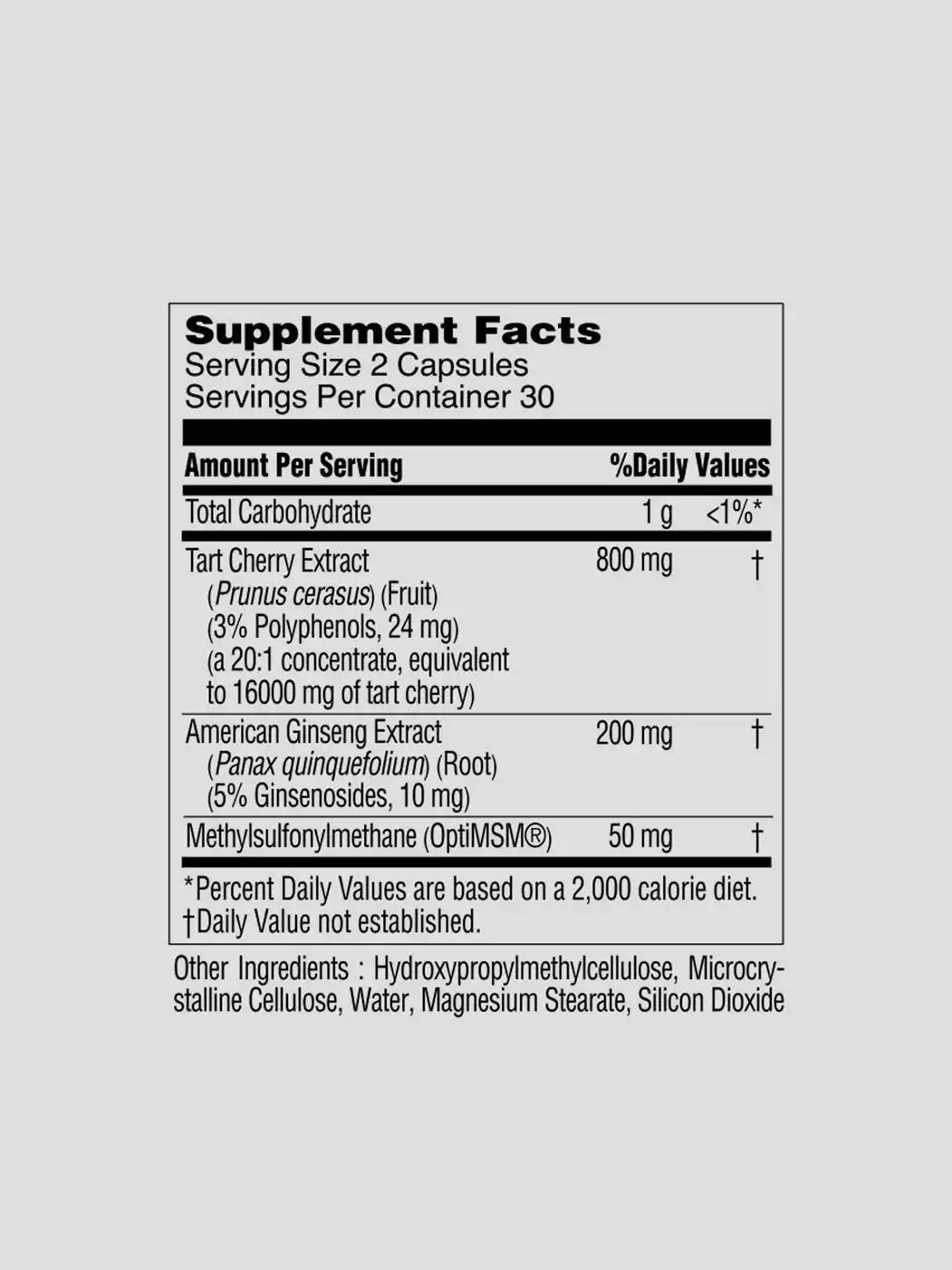 Extracto de cereza ácida, extracto de ginseng americano, metilsulfonilmetano (OptiMSM), hidroxipropilmetilcelulosa, celulosa microcristalina, agua, estearato de magnesio, dióxido de silicio