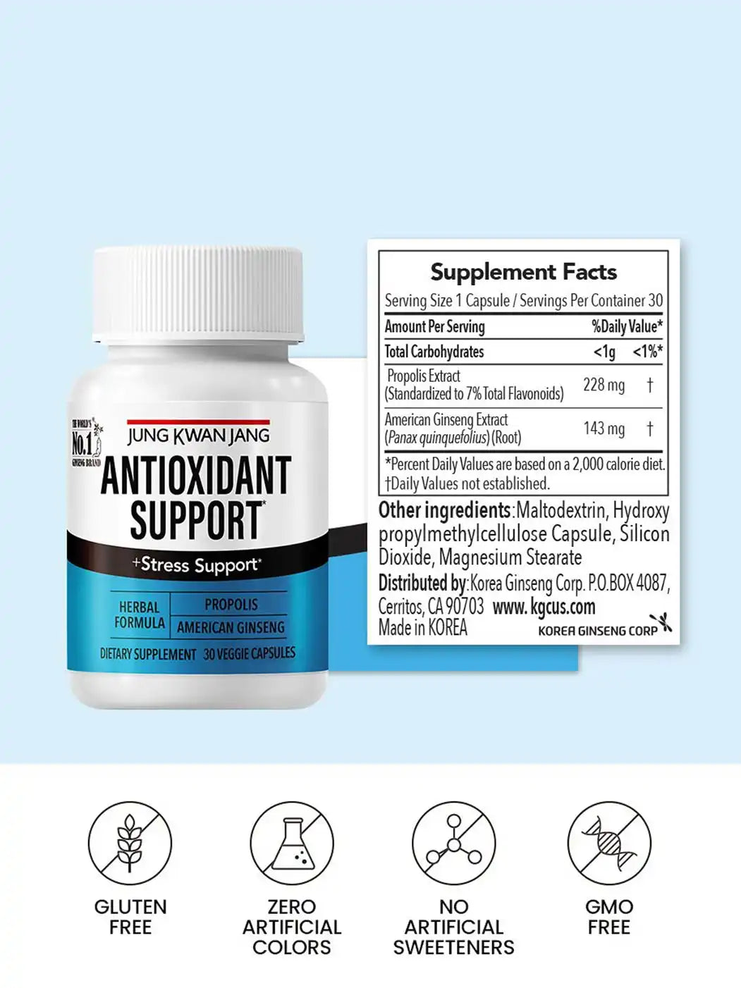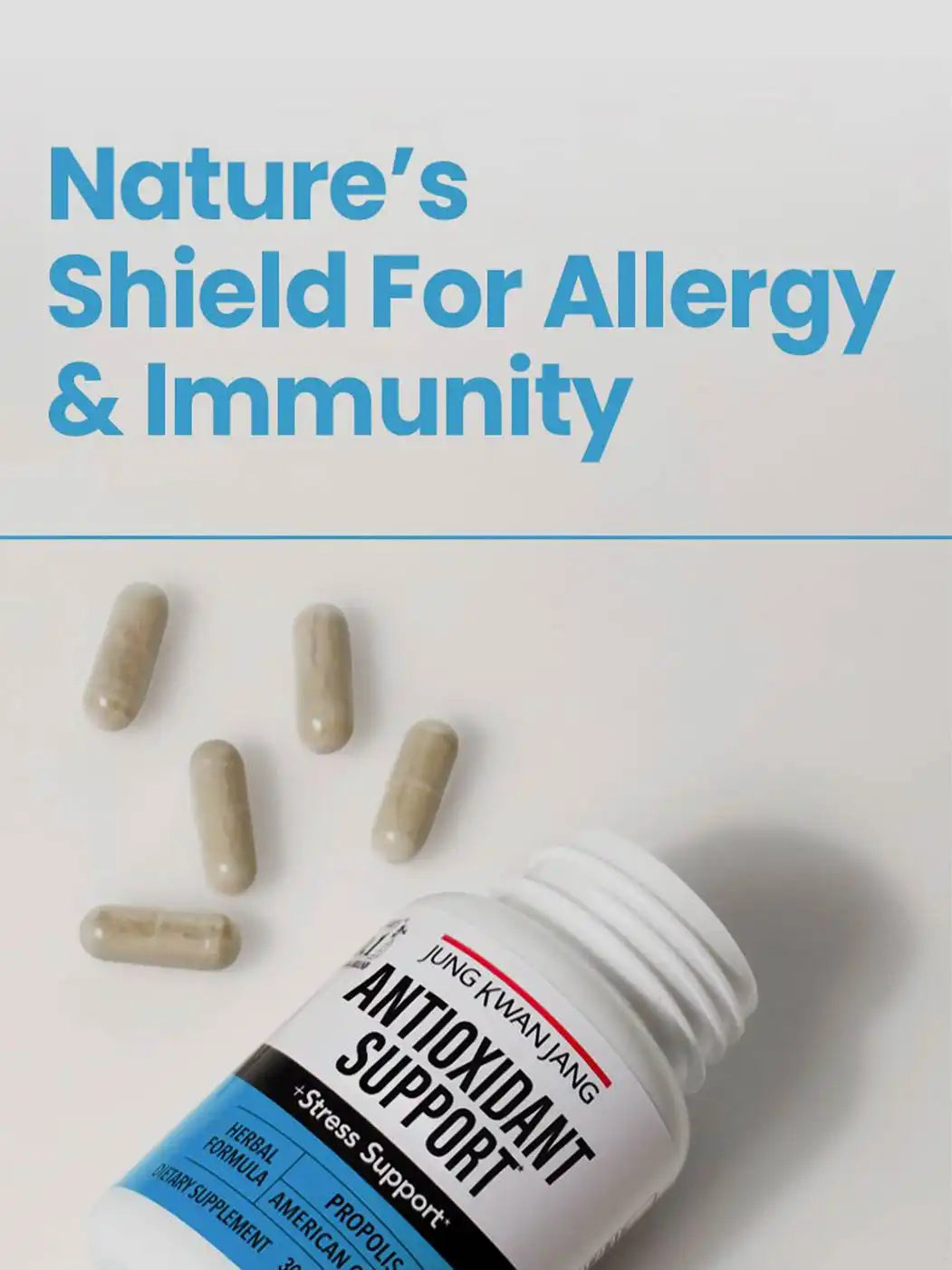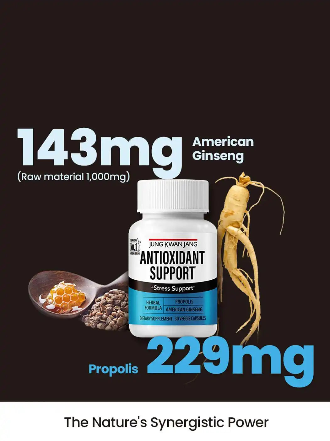 जुंगक्वानजांग एंटीऑक्सीडेंट प्रोपोलिस और अमेरिकी जिनसेंग के साथ - उन व्यक्तियों के लिए एकदम सही समाधान जो अपनी समग्र भलाई को बढ़ाने, अपनी प्रतिरक्षा प्रणाली को मजबूत करने और एलर्जी से राहत पाने का समर्थन करना चाहते हैं।