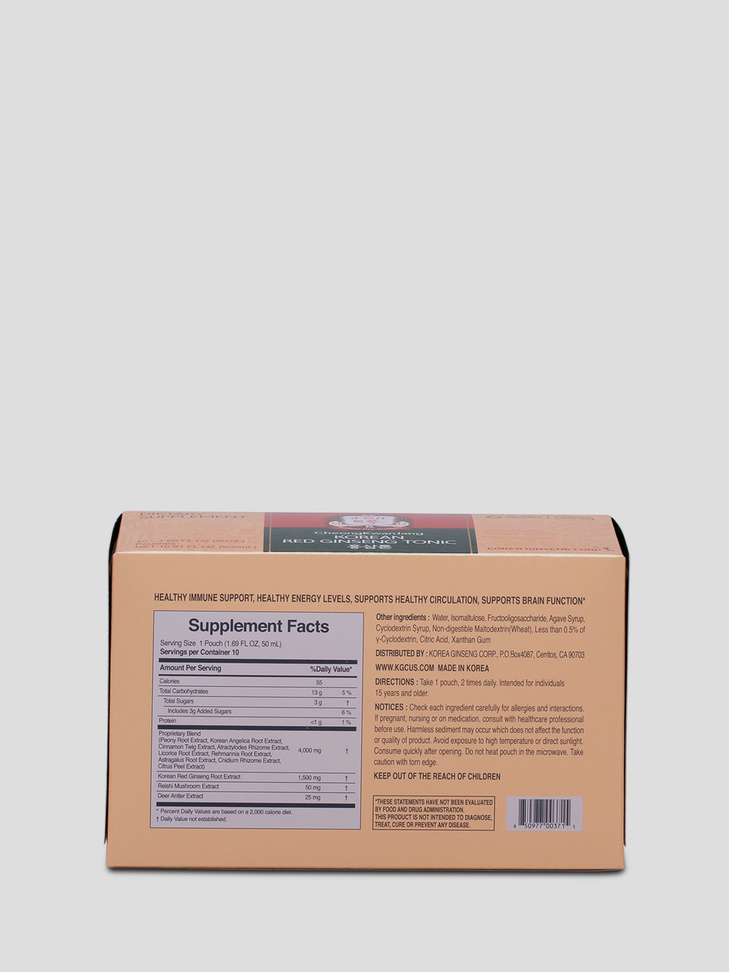 पीने के लिए तैयार थैली में परोसा गया, टॉनिक हल्का के मिश्रण से बना पेय है कोरियाई लाल जिनसेंग अर्क, और पूर्वी औषधीय पौधों से दस अलग-अलग जड़ी-बूटियाँ। टॉनिक माइल्ड के अनेक लाभों का आज ही अनुभव करें!