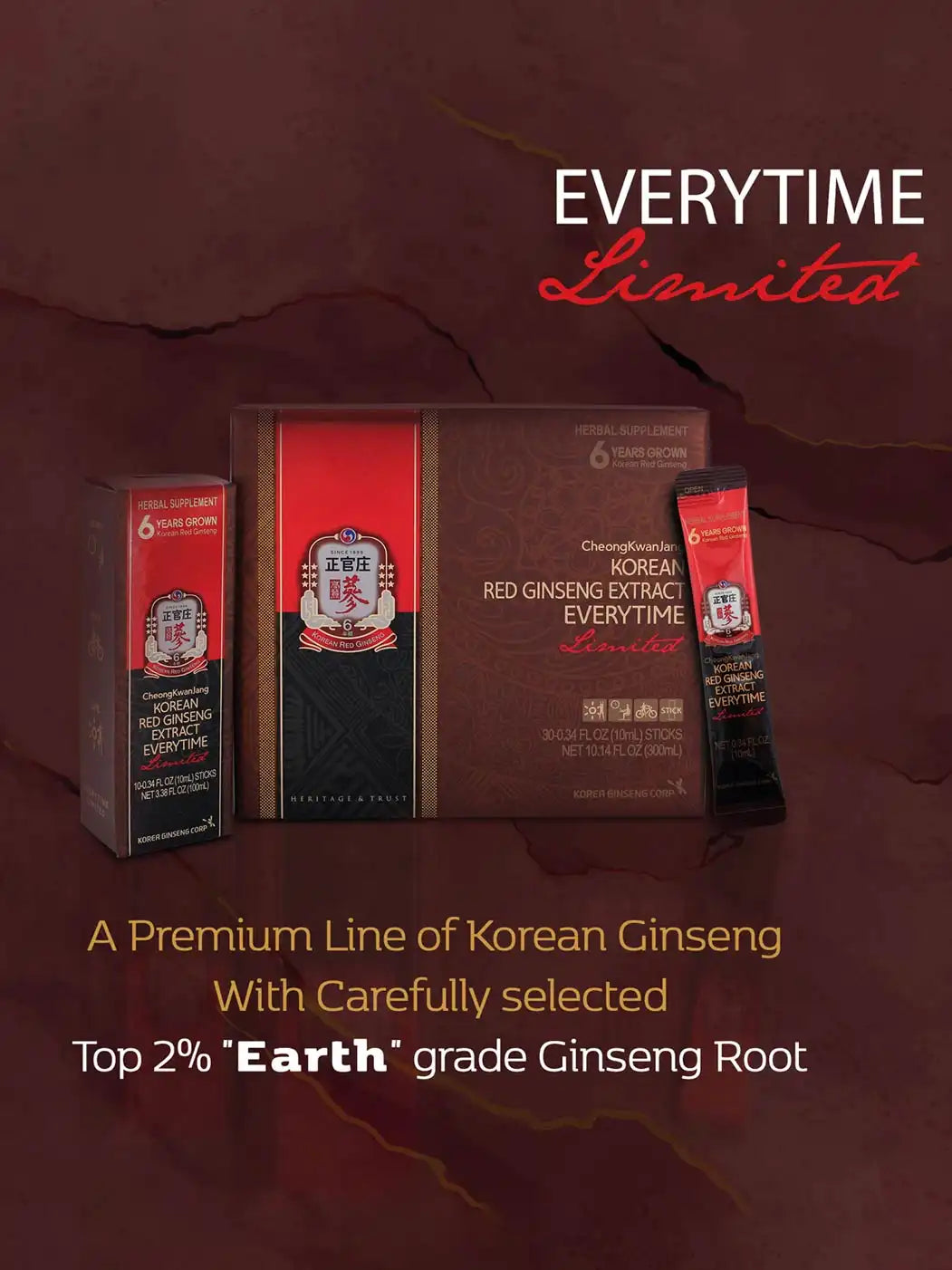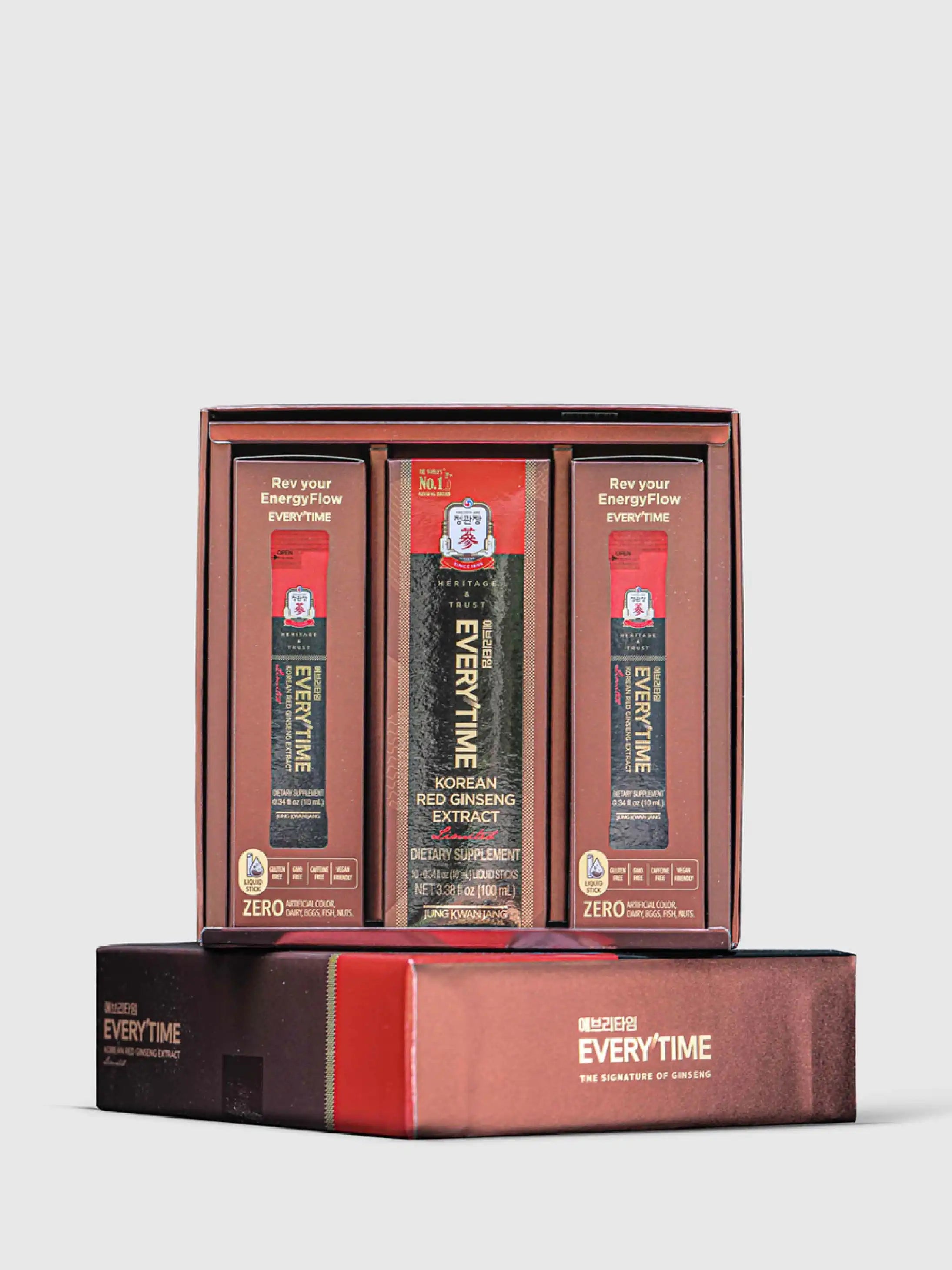 Discover the ultimate in ginseng quality with EVERYTIME Limited — a premium line made from the Top 2% “Earth” grade Korean Red Ginseng roots, grown for 6 years and carefully selected for exceptional potency.