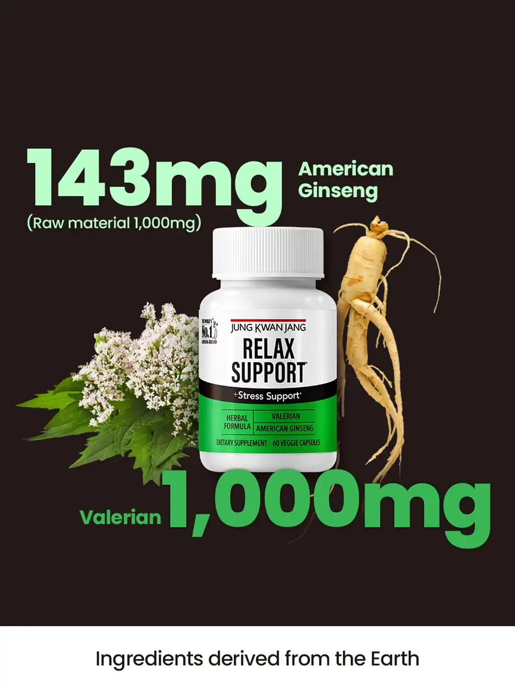 JungKwanJang Relax with Valerian and American Ginseng offers a natural solution to address the pain points of anxiety, relaxation, and stress. Valerian root, known for its calming properties, pairs perfectly with American Ginseng to provide a balanced approach to finding inner peace.