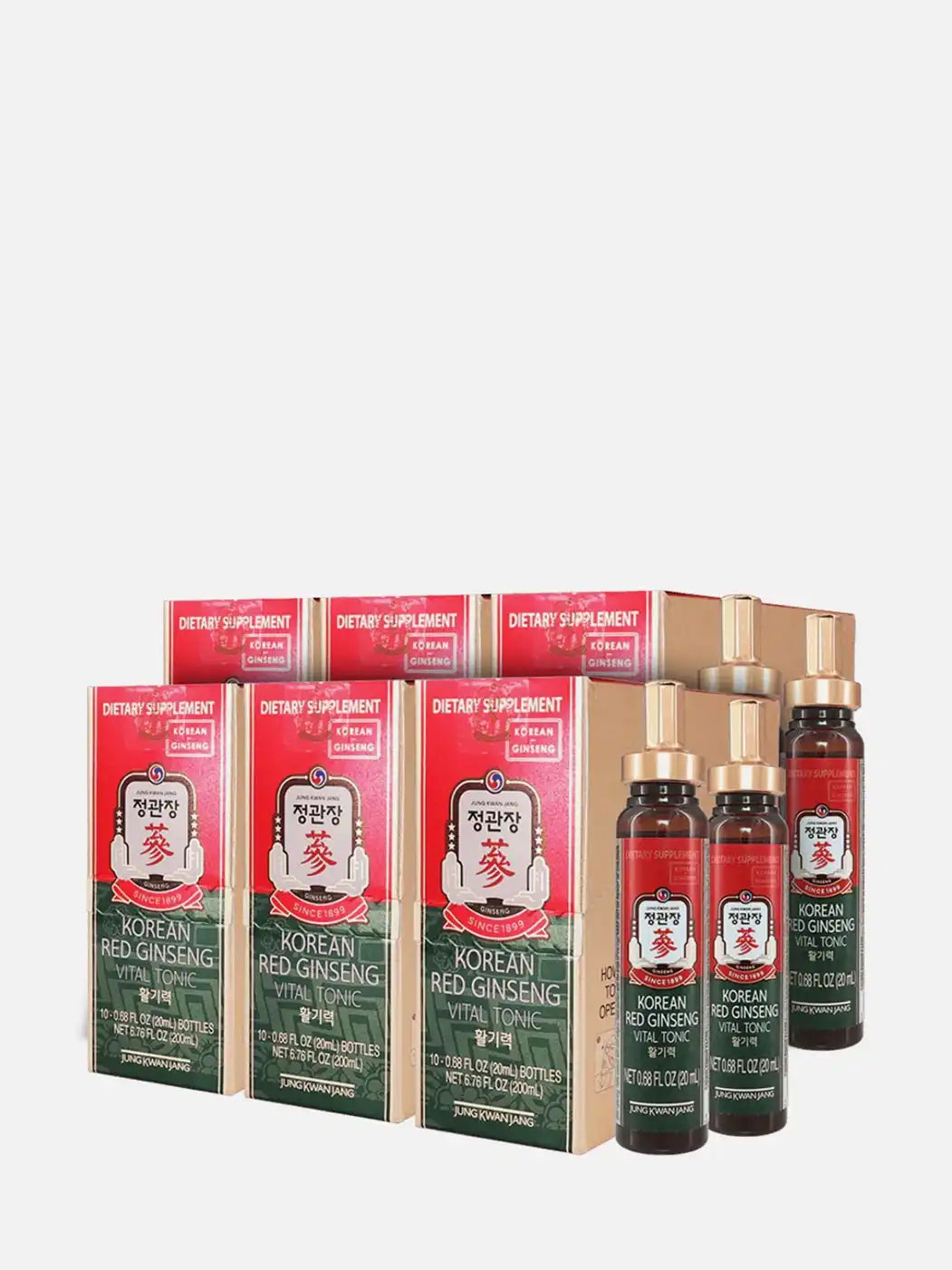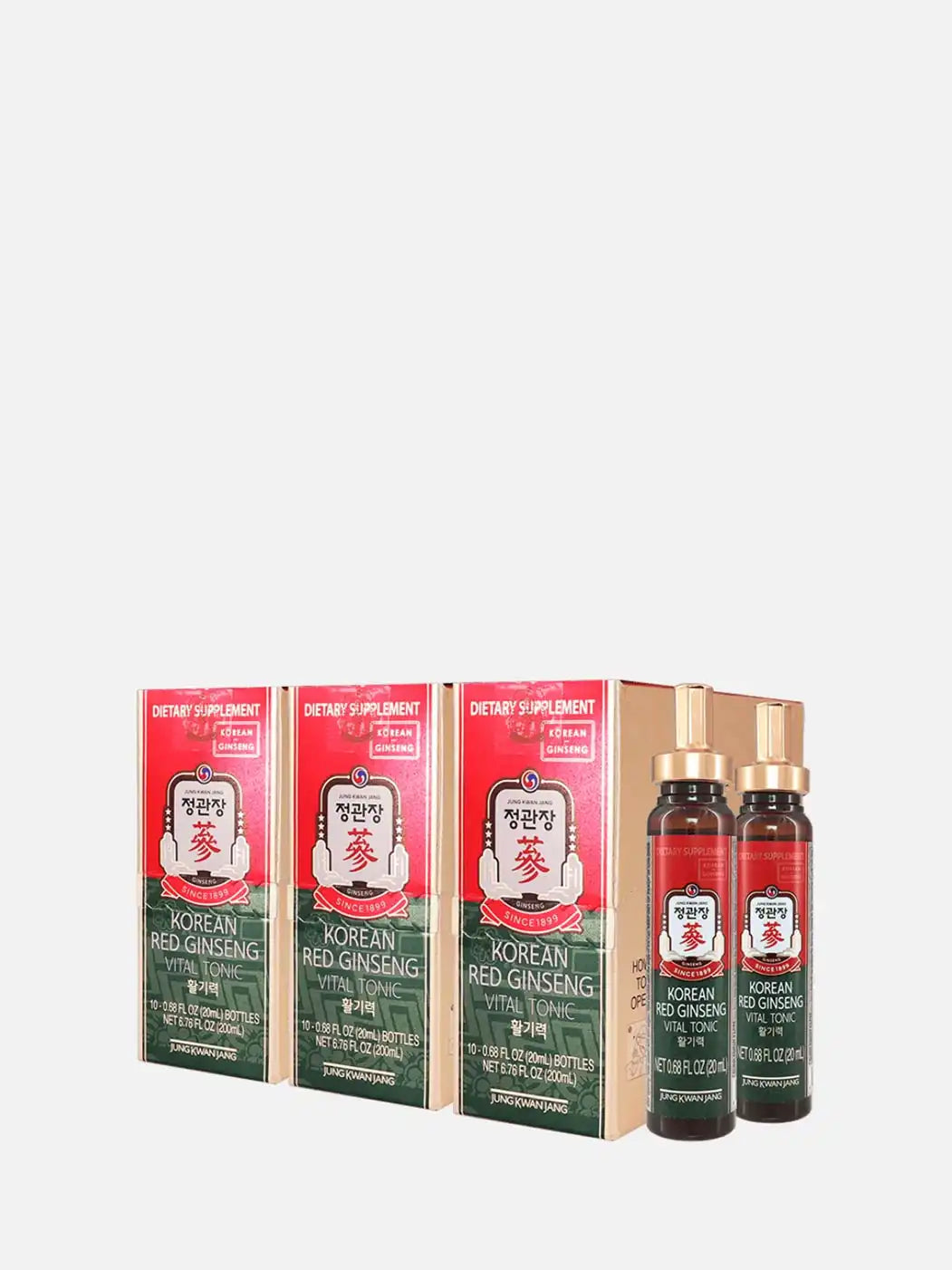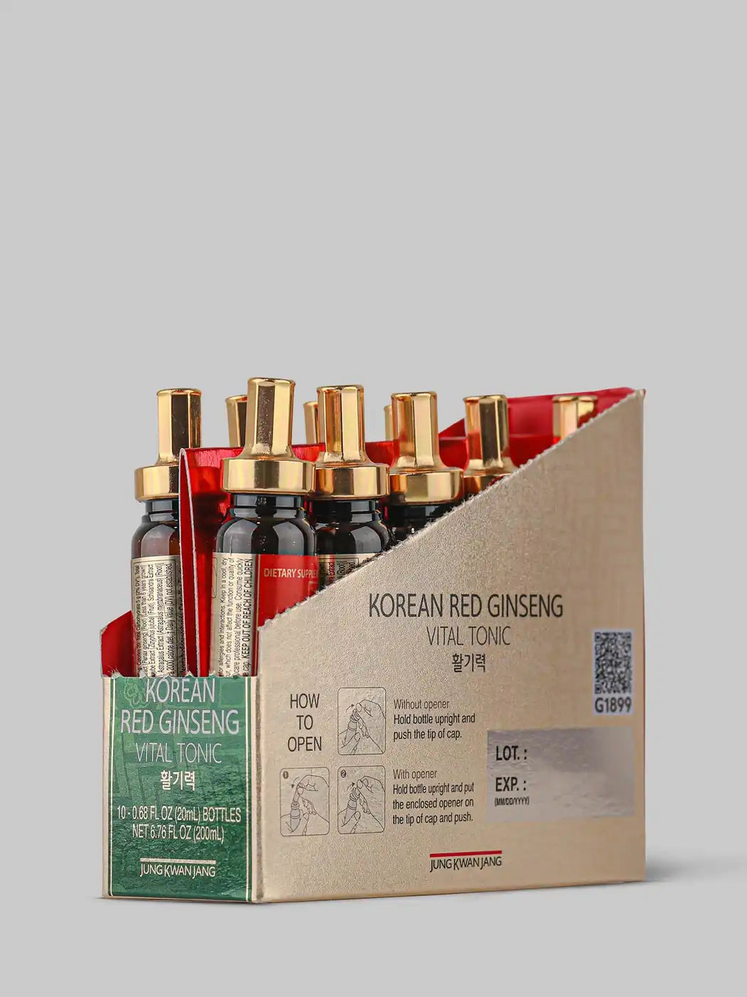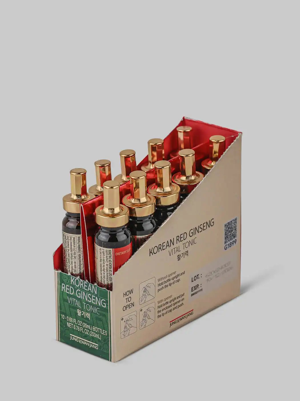 Introducing JungKwanJang Korean Red Ginseng Vital Tonic Shots, the ultimate solution for those tired of feeling drained and lifeless. Say goodbye to fatigue and hello to a revitalized, energized, and invigorated self with Vital Tonic!