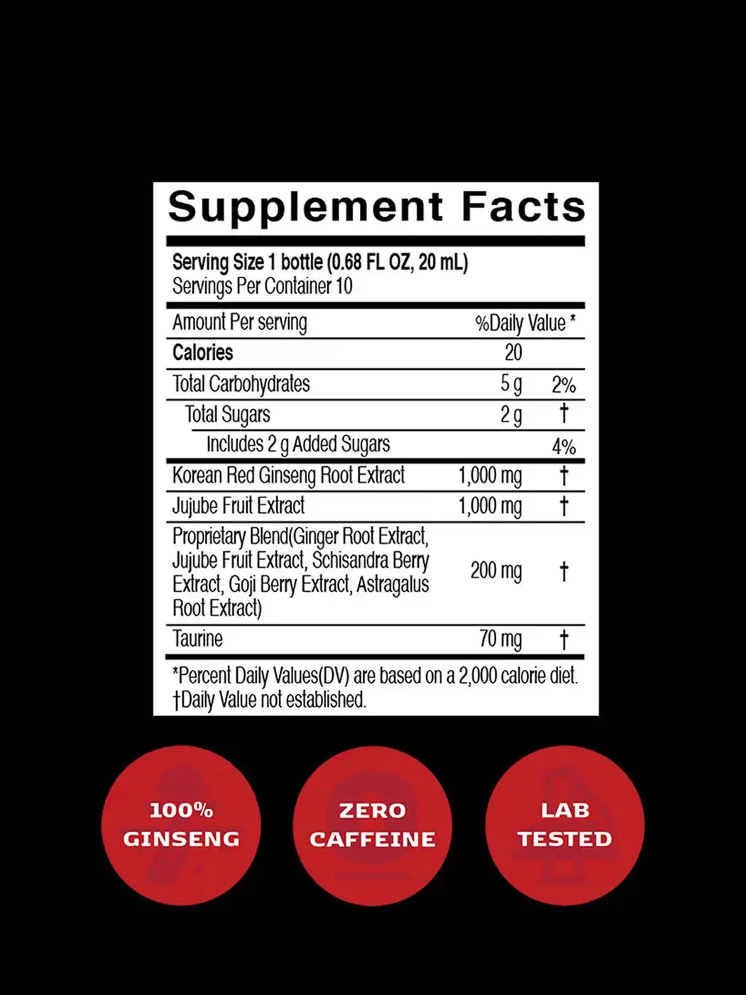 Red Ginseng Root Extract, Ginger Rhizome, Jujube Fruit, Schizandra Fruit, Lycium Fruit, Astragalus Root, Taurine, Grape Seed Extract, Water, Agave Syrup, Erythritol, Cyclodextrin Syrup, Citric Acid, Artificial Flavor, Trisodium Citrate, Gellan Gum |