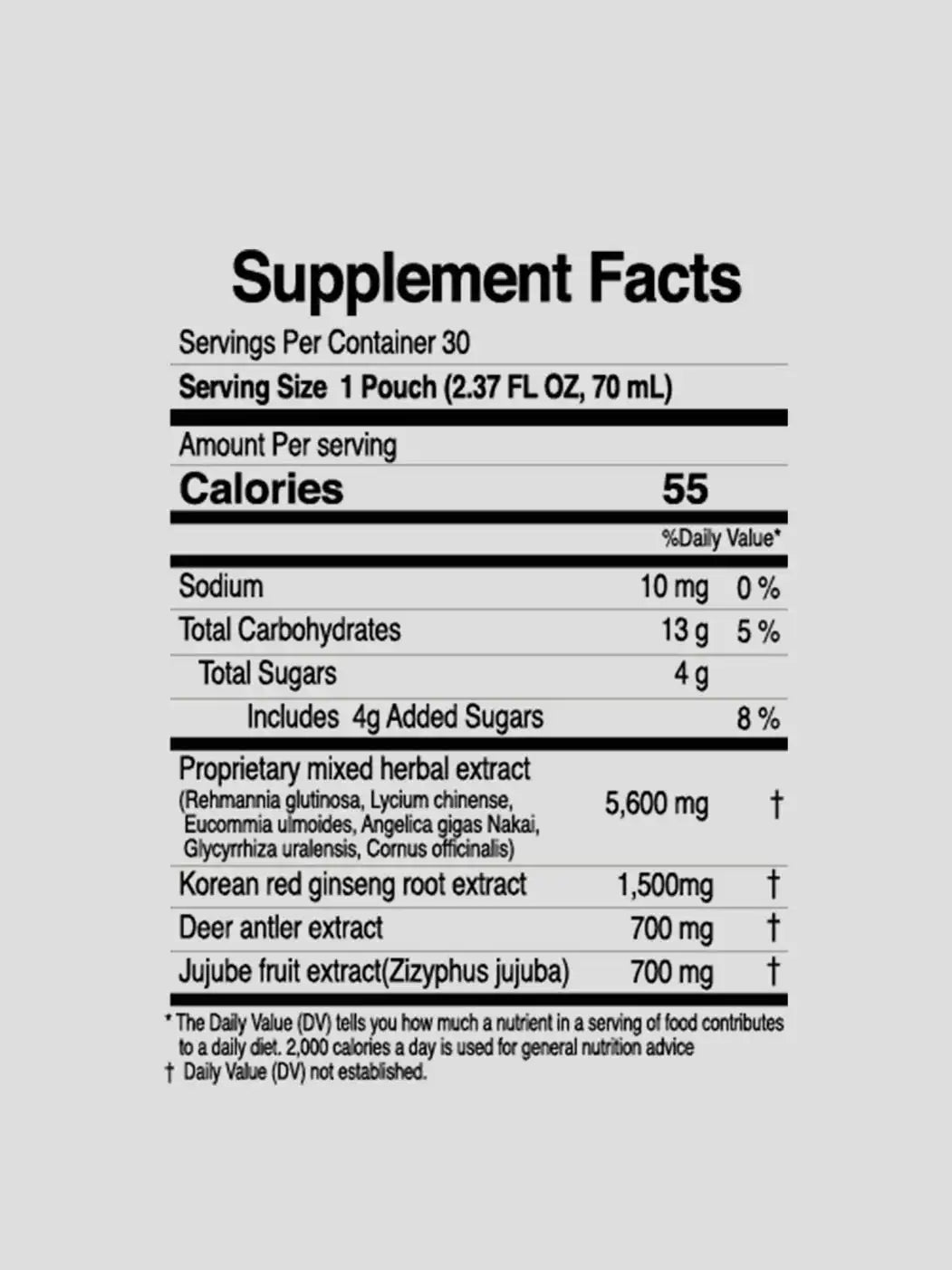 Mistura proprietária de ervas (Rehmannia glutinosa, Lycium chinense, Eucommia ulmoides, Angelica Gigas Nakai, Glycyrrhiza uralensis, Cornus officinalis), extrato de raiz de ginseng vermelho coreano, extrato de veludo de chifre de veado, extrato de fruta jujuba |