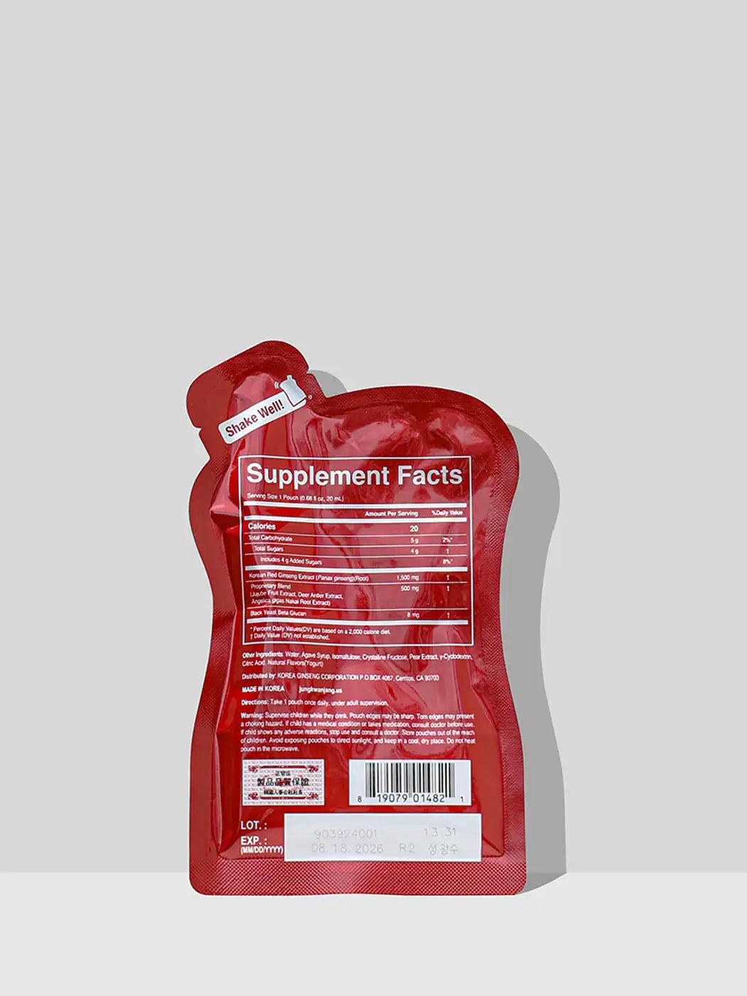 Extrato de raiz de ginseng vermelho, vitamina A, vitamina C, tiamina, riboflavina, niacina, vitamina B6, extrato de fruta jujuba, extrato de raiz de Angelica Gigas, extrato de aureobasídio seco, extrato de chifre de veado, água purificada, isomaltulose, xarope de agave, fruto-oligossacarídeo, galacto -Oligossacarídeo, concentrado de suco de pêra, γ-ciclodextrina, sabores naturais, ácido cítrico |