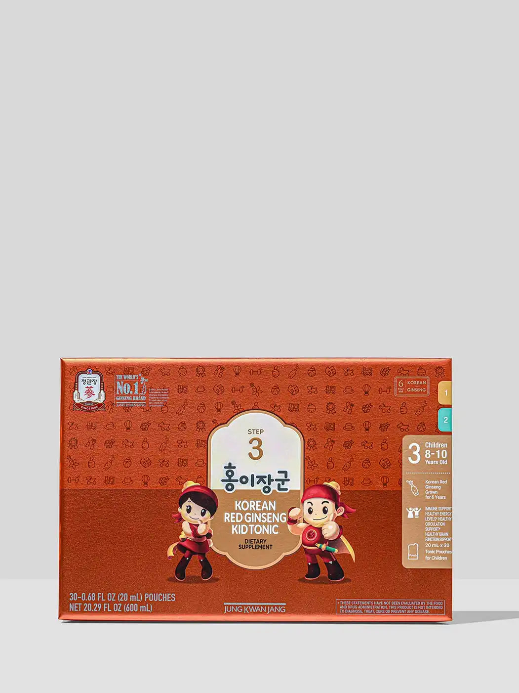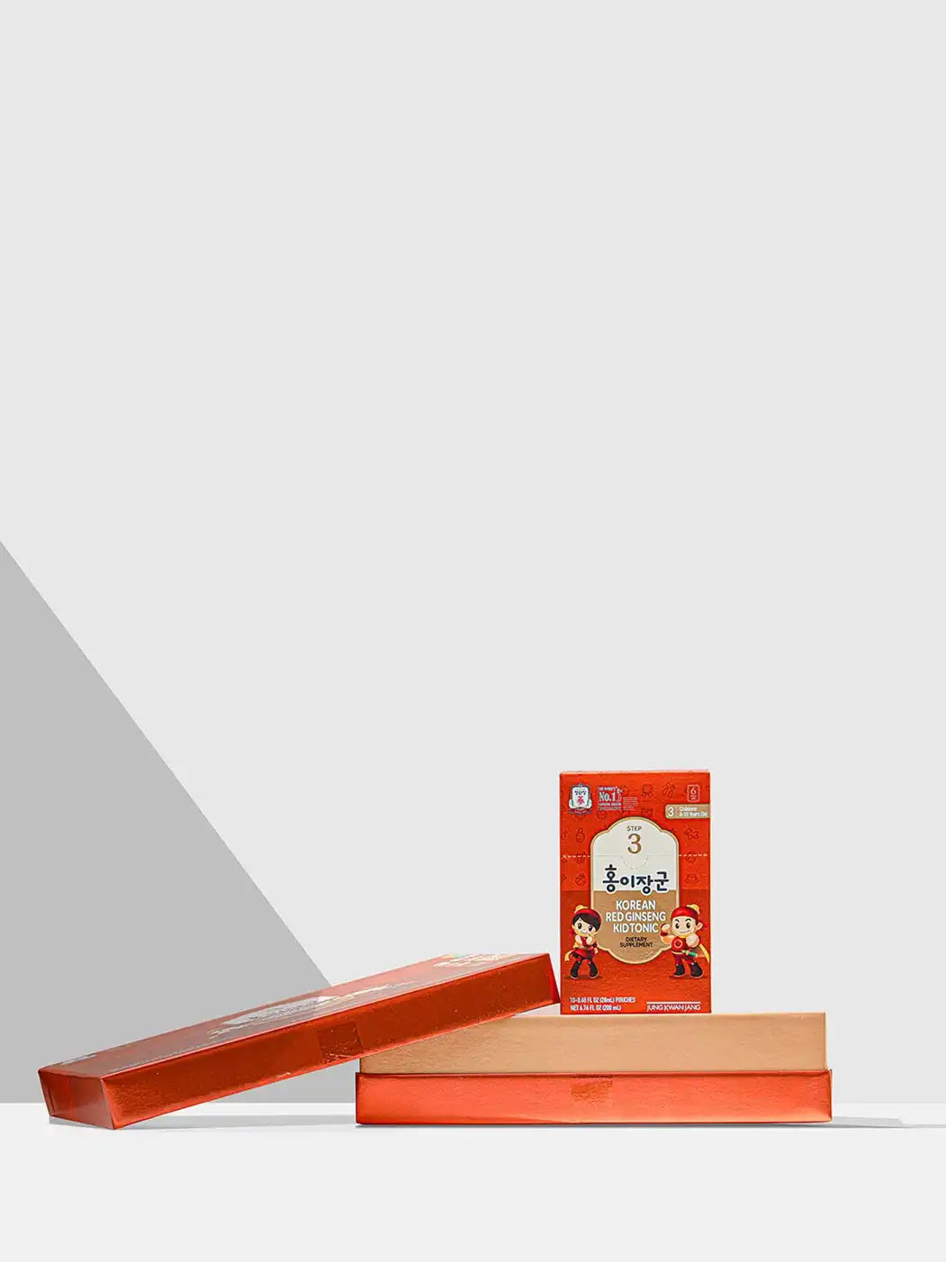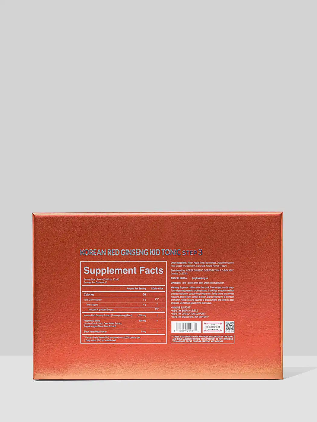 Projetado pensando nos seus filhos, este é o terceiro passo da série CheongKwanJang Kid Tonic. Esta etapa ajuda a construir uma base sólida para a saúde e fornece aos seus filhos todos os ingredientes necessários para ajudá-los a construir um sistema imunológico forte. Com Ginseng Vermelho Coreano, Chifre de Veado e muitos outros ingredientes valiosos, este é um tônico feito para seus filhos e deve fazer parte da sua rotina.