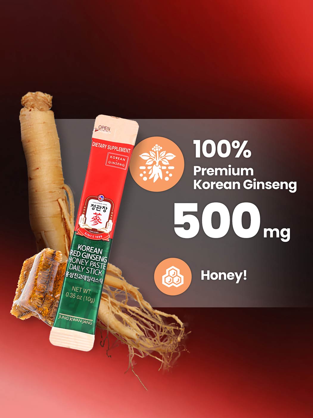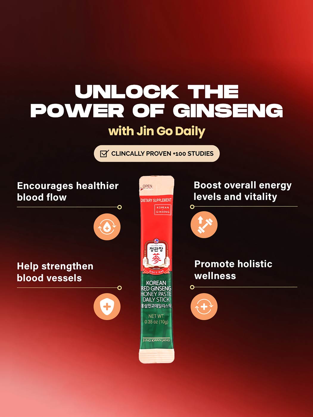 Bạn đang tìm kiếm một cách tự nhiên và lành mạnh để tăng cường năng lượng nhanh chóng? Không cần tìm đâu xa hơn JungKwanJang Jin Go Daily Stick! Với công thức là sự pha trộn của Hồng sâm Hàn Quốc, mật ong, Chiết xuất nấm Poria và Chiết xuất rễ cây Rehmannia, thanh năng lượng tiện lợi này được thiết kế để cung cấp cho bạn năng lượng và sự tập trung mà bạn cần khi di chuyển.