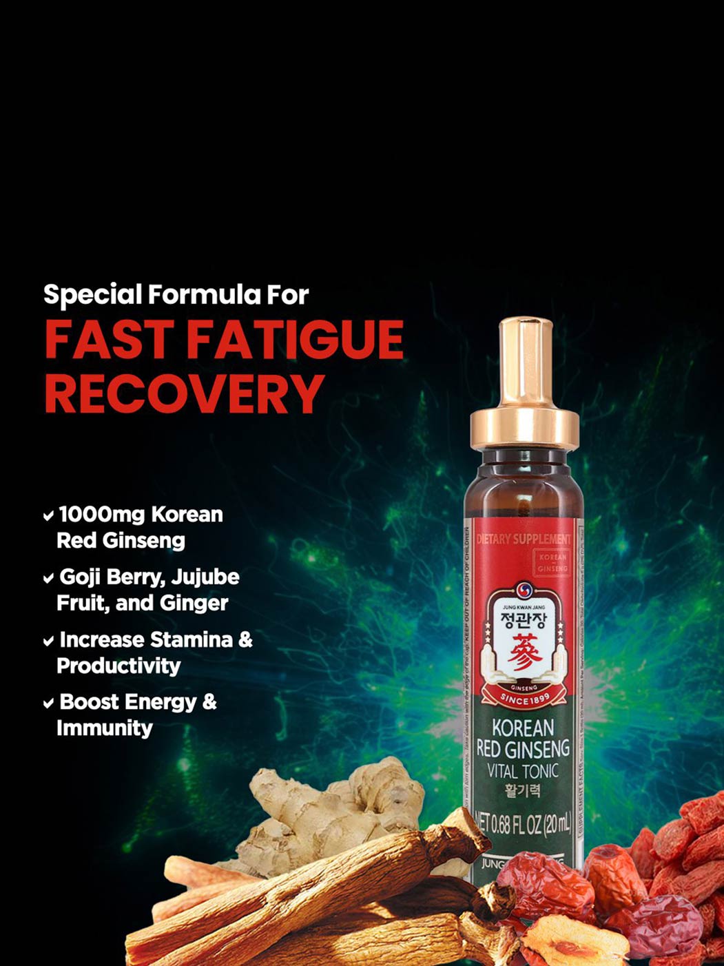 隆重推出 JungKwanJang 韩国红参活力补品,这是那些厌倦了疲惫和毫无生气的人的终极解决方案。使用 Vital Tonic 告别疲劳,迎接焕发活力、活力四射的自我!